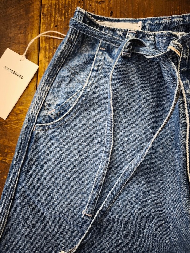 テーパードシルエットのワイドデニム。 穿くだけで格好良いワイドシルエットのデニムパンツ。 佇まいがソリッドで印象的なフォルムになるように、 外側に向かって丸いカーブを描くようパターン設計されています。 トップスや靴のバランスで着用位置が変えられるように股上を深くしています。 ハイウエストでもローウエストでも、穿く位置が変わると着こなしに変化をつけることが できて、コーディネートの幅が広がる一本です。 ウエストの紐は肩にまわしてサスペンダー風にも使えるので、 ぜひ自由にアレンジしてお楽しみください。 サイズ(cm):1(ウエスト66 / ヒップ107 / 裾周り47 / 股上37 / 股下59 / 着丈96 ) 2(ウエスト68 / ヒップ110 / 裾周り49 / 股上38 / 股下63 / 着丈101 ) ※多少個体差がございます。 素材:綿100% made in JAPAN ※モニターの設定状況によって実際の商品と若干色が異なる場合がございます。 We are sorry! We haven't been ready to send overseas. ※当商品は弊社実店舗でも販売いたしております。 オーダーをいただいたタイミングによっては、オンラインショップ上の在庫数と実在個数に差異がある場合がございます。 在庫切れの場合は、商品をご用意できない場合がございます。 商品の在庫管理とオンラインショップの更新については、出来る限り対応をしておりますので、何卒ご理解いただけますようお願いいたします。