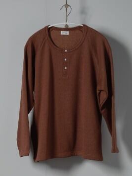 リネンの程良い光沢があり、すっきりと着れるサイズ感のヘンリーネックロンT。