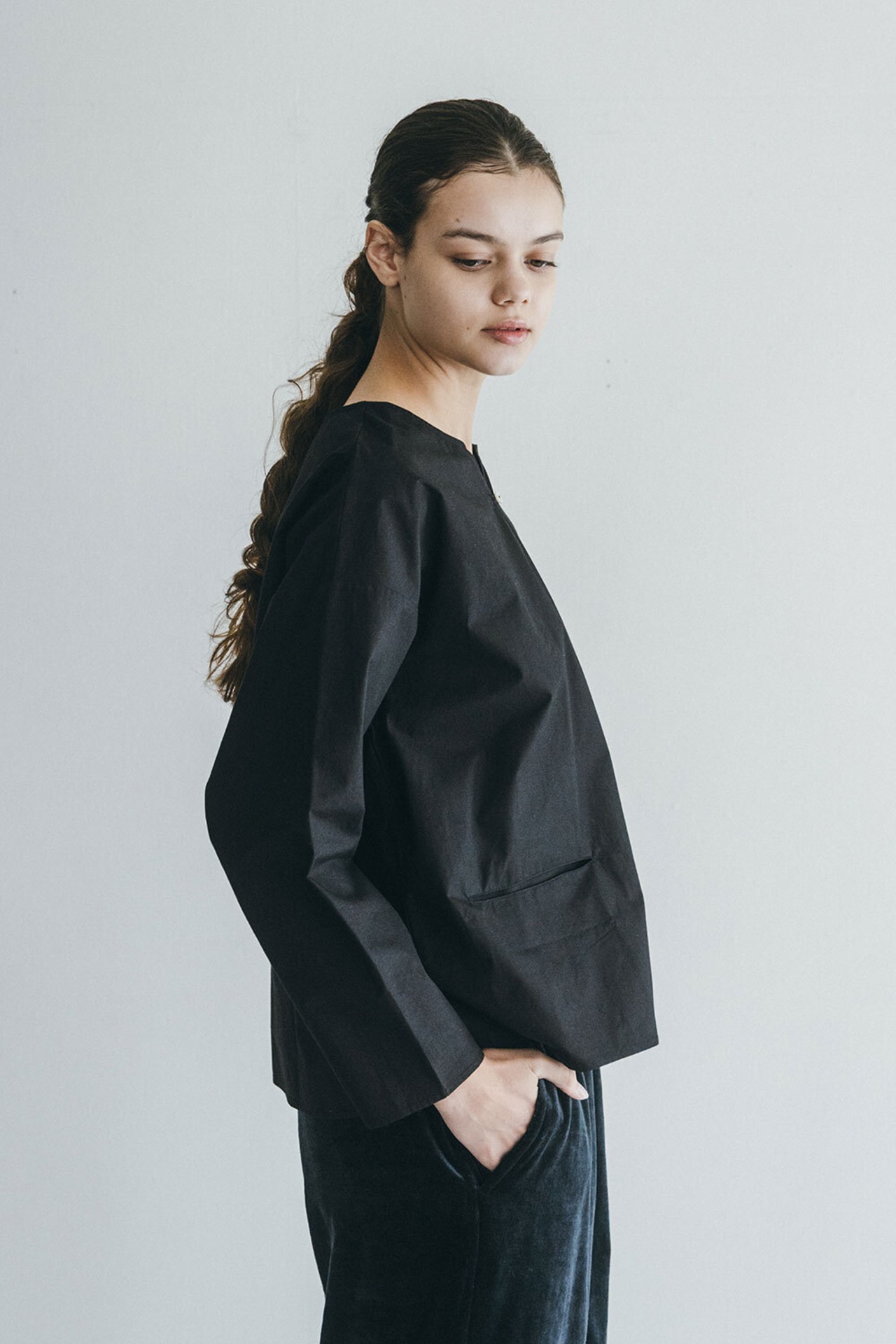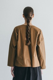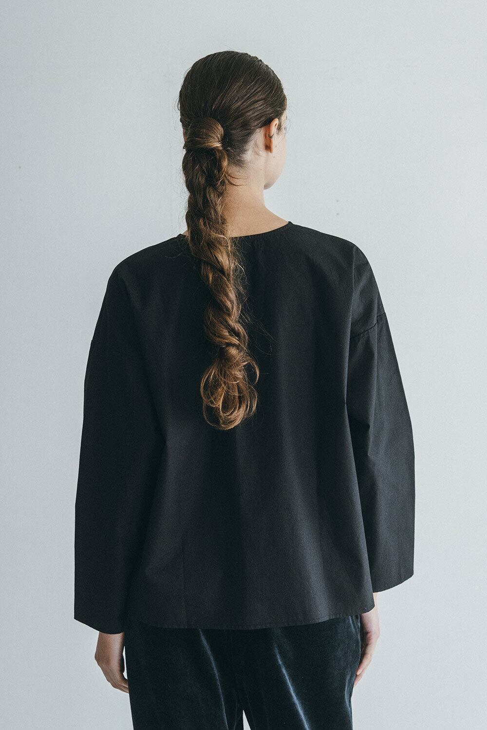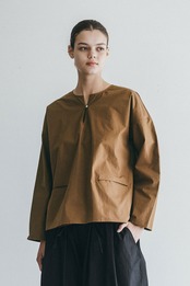 ハリのあるコットン生地で仕立てた、ボックス型のプルオーバー。ドロップショルダーとゆったりとした身幅で、体のラインを拾わず、リラックス感のある着心地に仕上げました。首元は深めのスリットあきに、ひとつボタンを配したデザインで、襟なしのすっきりとした印象に女性らしさをプラスしました。フロントのポケットがさりげないアクセントにも。シンプルな中に個性が光る一着です。