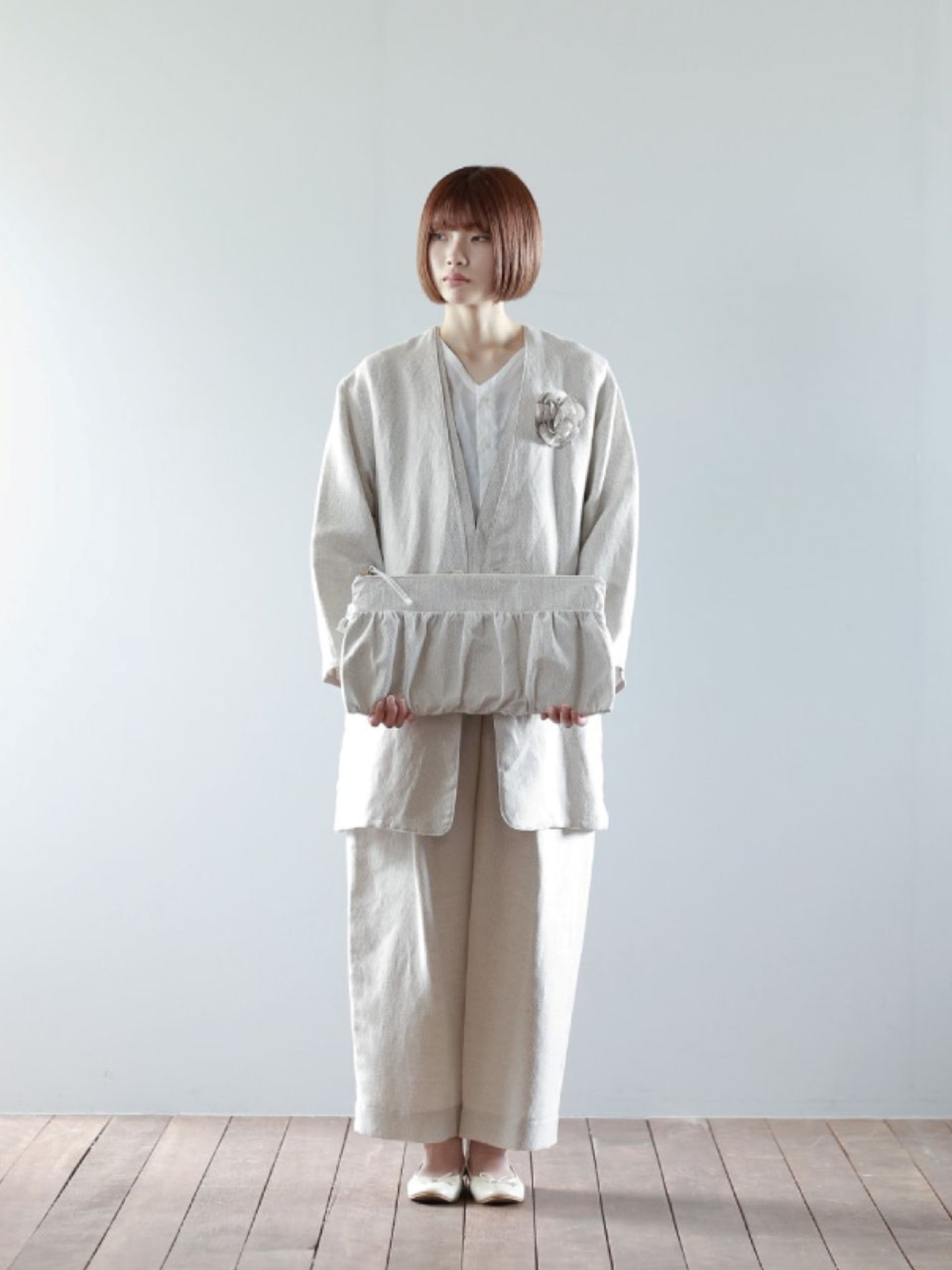 織り柄が特徴的なリネンポリエステル混素材を使用したギャザークラッチ。