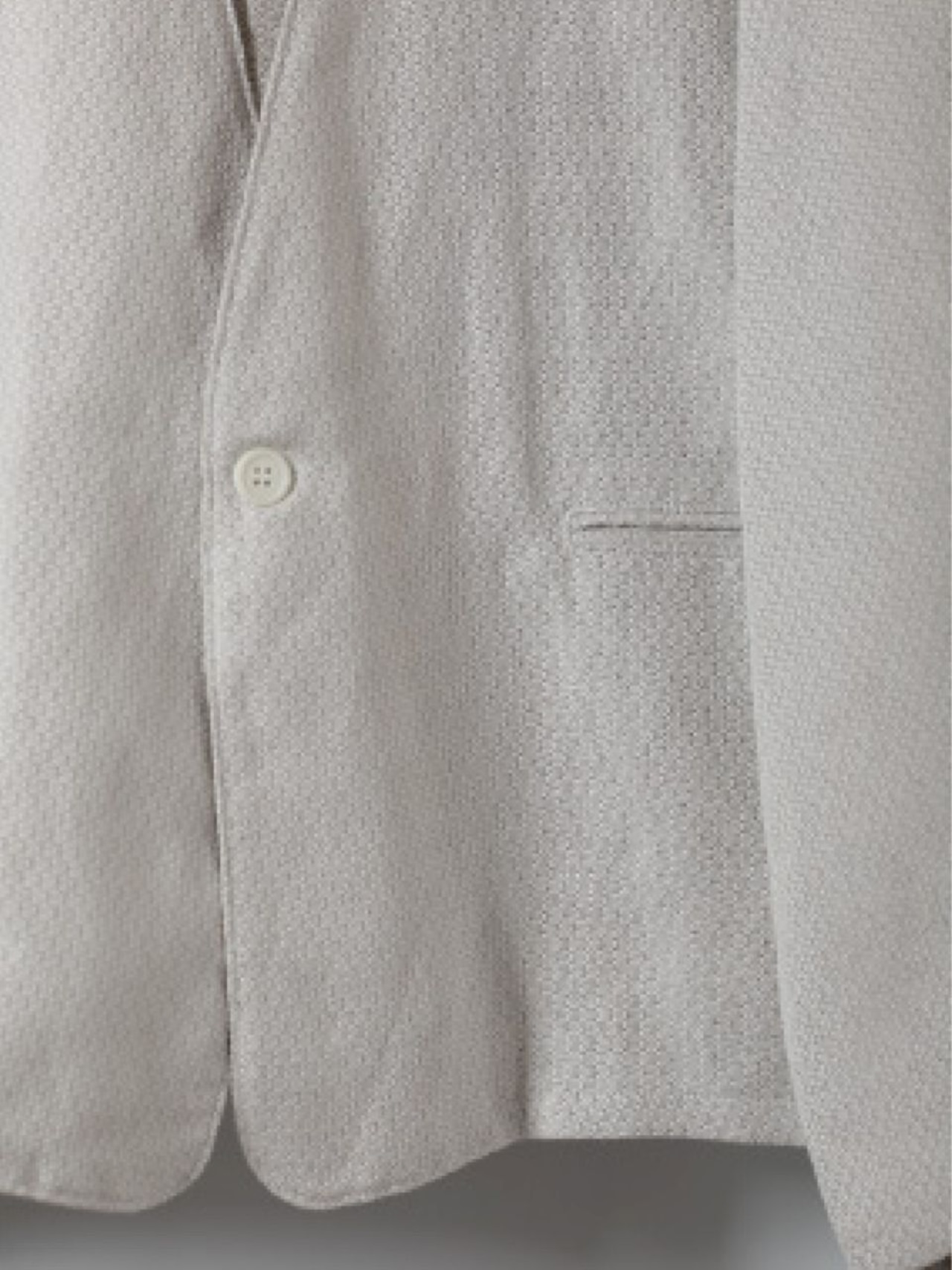 織り柄が特徴的なリネンポリエステル混素材を使用したノーカラージャケット。