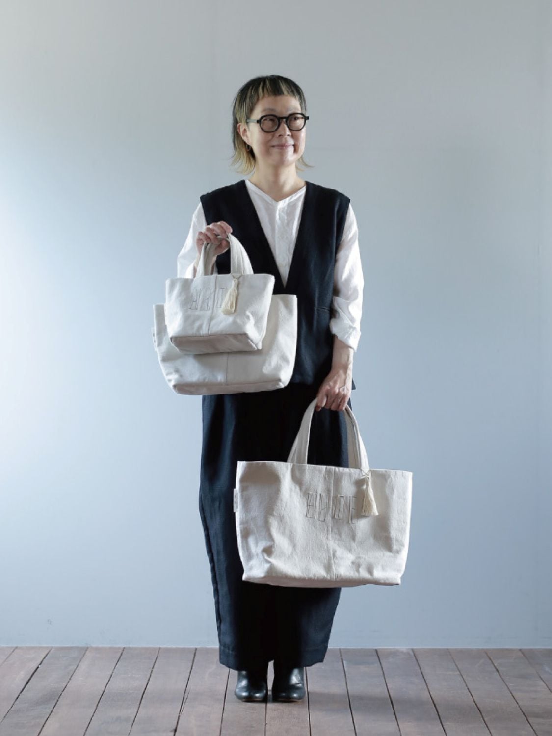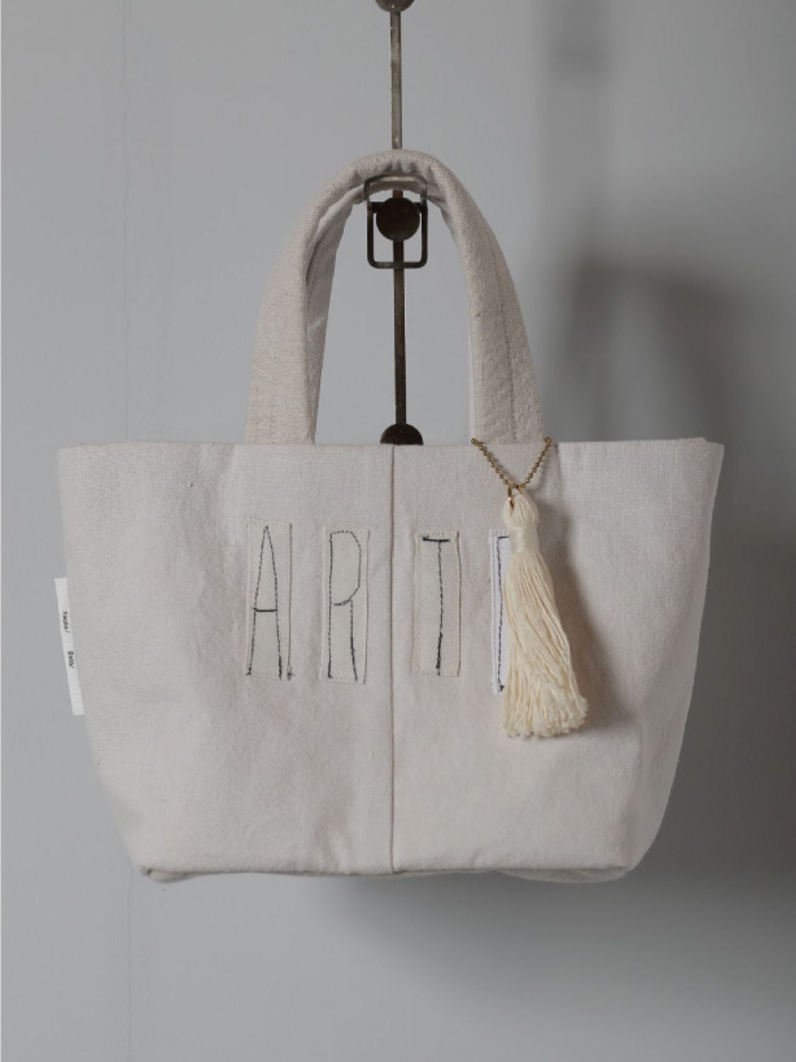ステッチによるARTEの文字がアクセントになって、手づくりの綿糸タッセルが付きます。