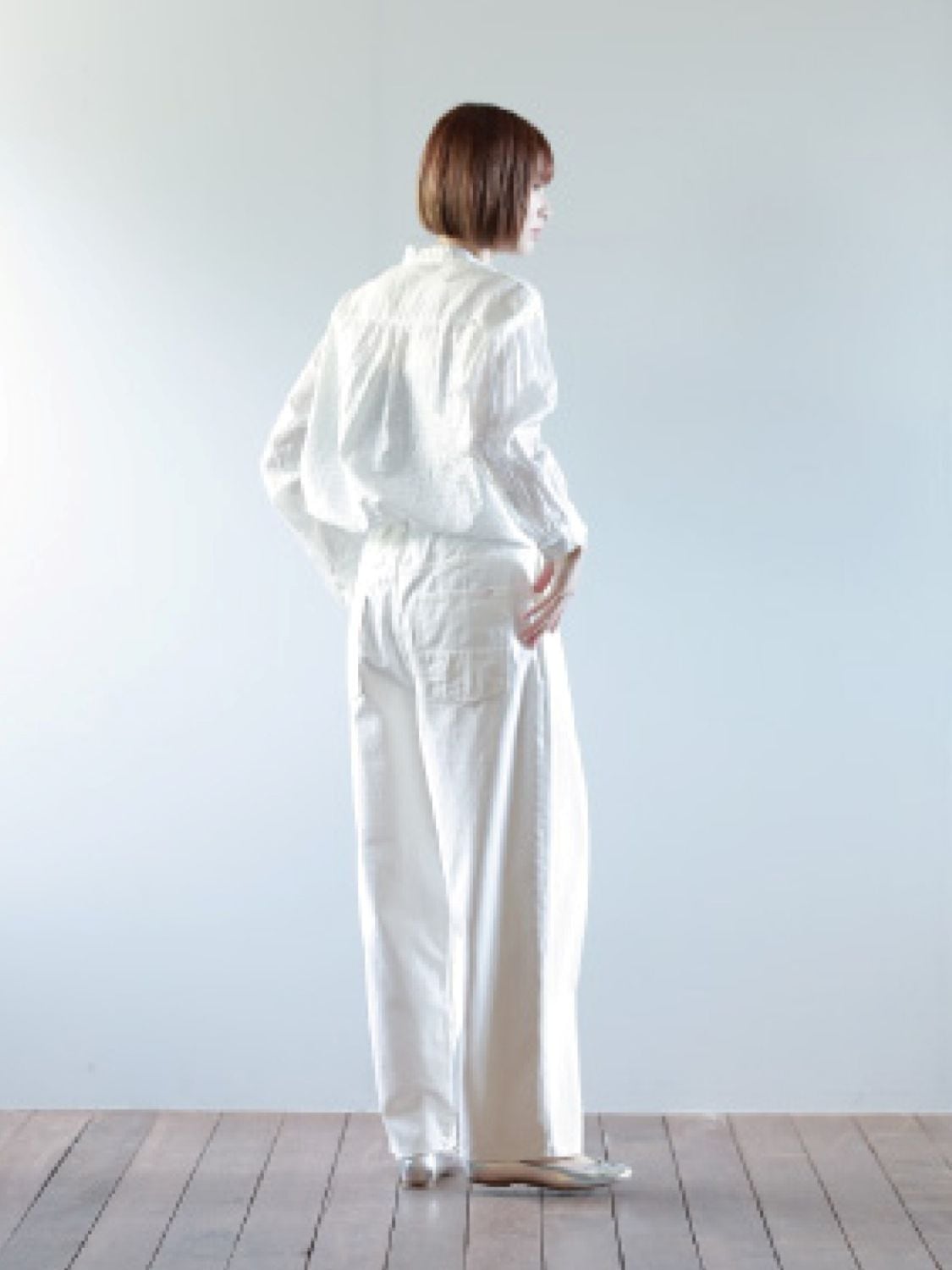 裾に向かってテーパードするバギーシルエットのデザインです。